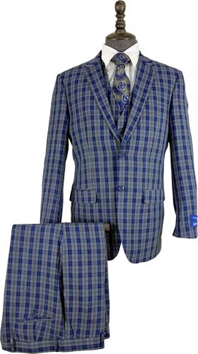 Navy Blue/Green Plaid 3 Pcs. Modern Fit Suit (Item#: PLD2144-3 )