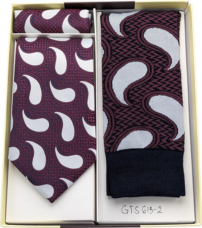 Burg./Silver Tear Drop 3Pcs.Tie/Hanky and Socks Gift Set (Item#: GTS613-2 )