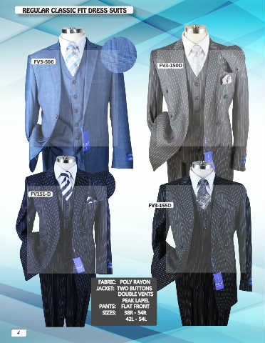 REGULAR CLASSIC FIT DRESS SUITS FV3-506 FV3-150D FV151-D FV3-155D FABRIC: POLY RAYON JACKET: TWO BUTTONS DOUBLE VENTS PEAK LAPEL PANTS: FLAT FRONT SIZES: 38R - 54R 42L - 54L